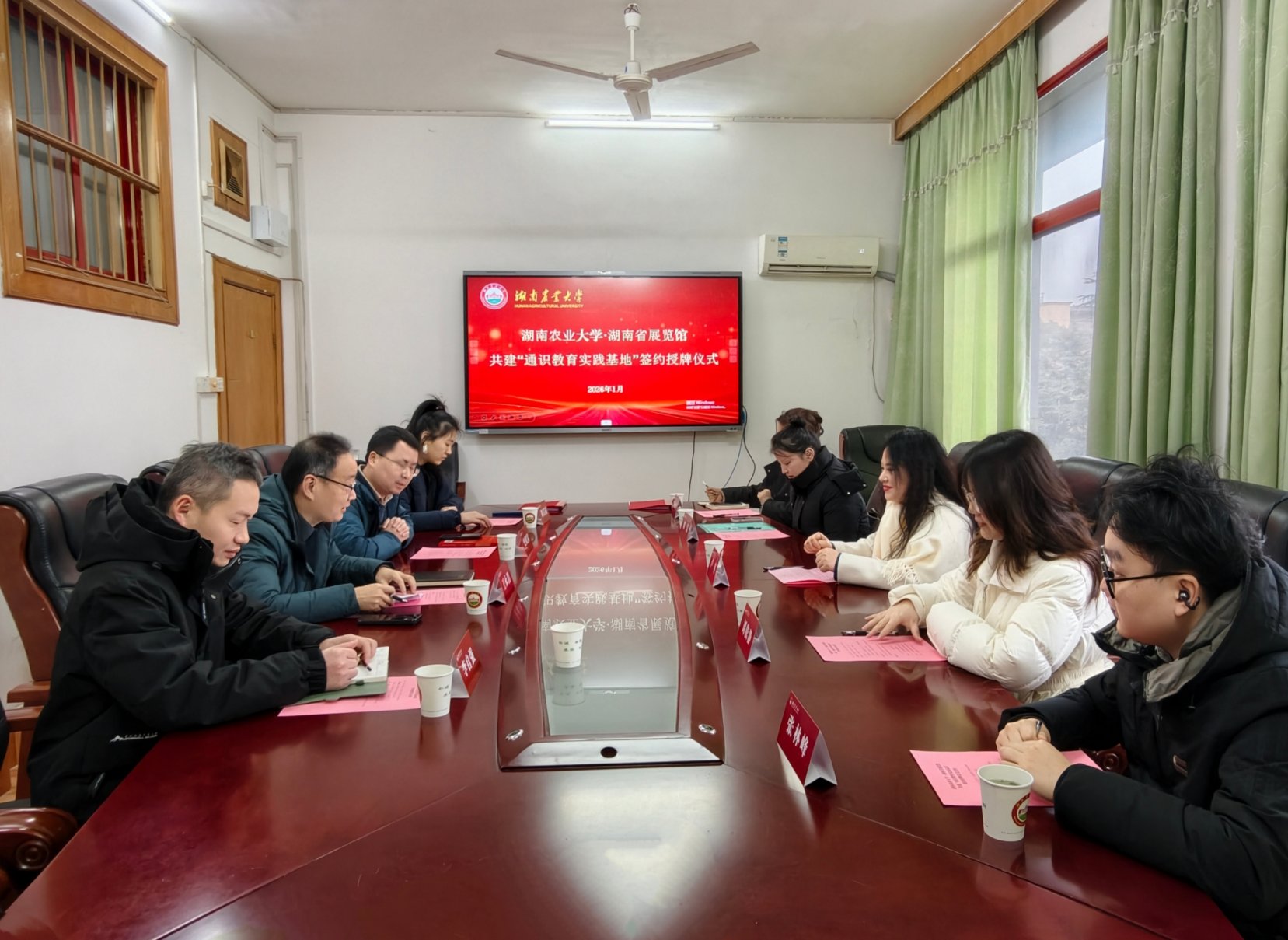 本网讯(通识教育中心 郑若菡)1月22日上午,我校与湖南省展览馆共建“通识教育实践基地”签约授牌仪式在求真楼314会议室举行。湖南省展览馆副馆长卢英、湖南农业大学通识教育中心主任王永昌、副主任史晓雷以及双方相关工作人员出席仪式,仪式由史晓雷主持。